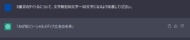 上記では、特定のキーワードに対する記事のタイトル案を3つ質問しています。その結果、指定通りに3つのタイトル案が得られました。このなかで、2番目のタイトル案に着目し、タイトルの文字数を28文字~32文字になるように改善してもらいます。プロンプトと実行結果は以下のとおりです。