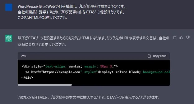上記では、WordPressのブログ記事内に設定するCTAゾーンのカスタムHTMLの記述を指示しています。その結果、指示通りにカスタムHTMLのコードを得ることができました。