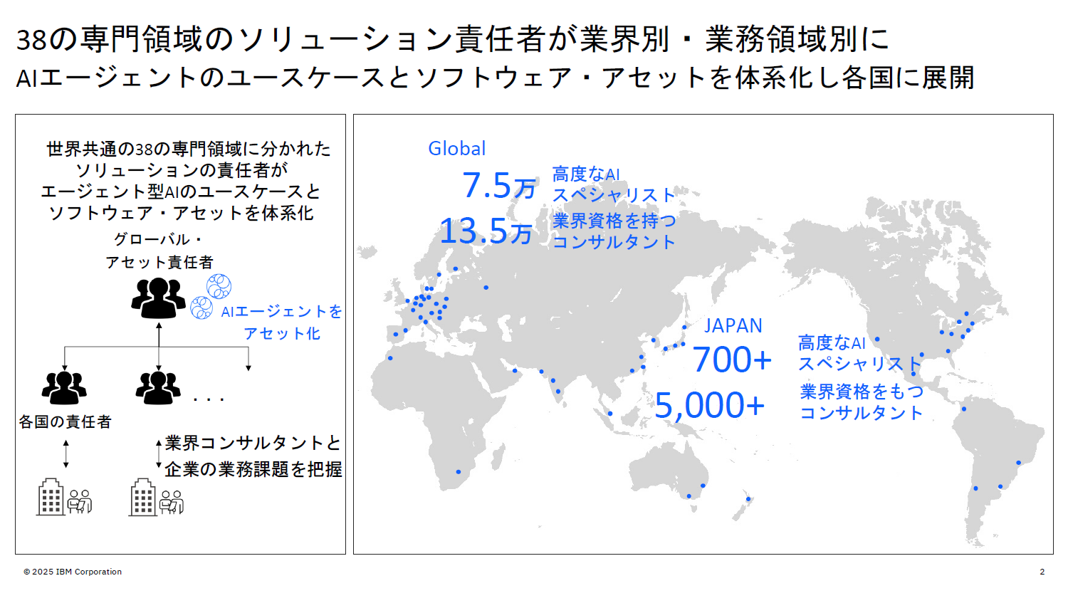 さらに、世界共通の38の専門領域に分かれたソリューション責任者が、各業界や業務に特化したエージェント型AIのユースケースやソフトウェア・アセットを体系化。これらの知見はグローバルに共有され、日本国内でも700名以上のAIスペシャリストと5,000名以上の業界コンサルタントが企業を支援しています。
