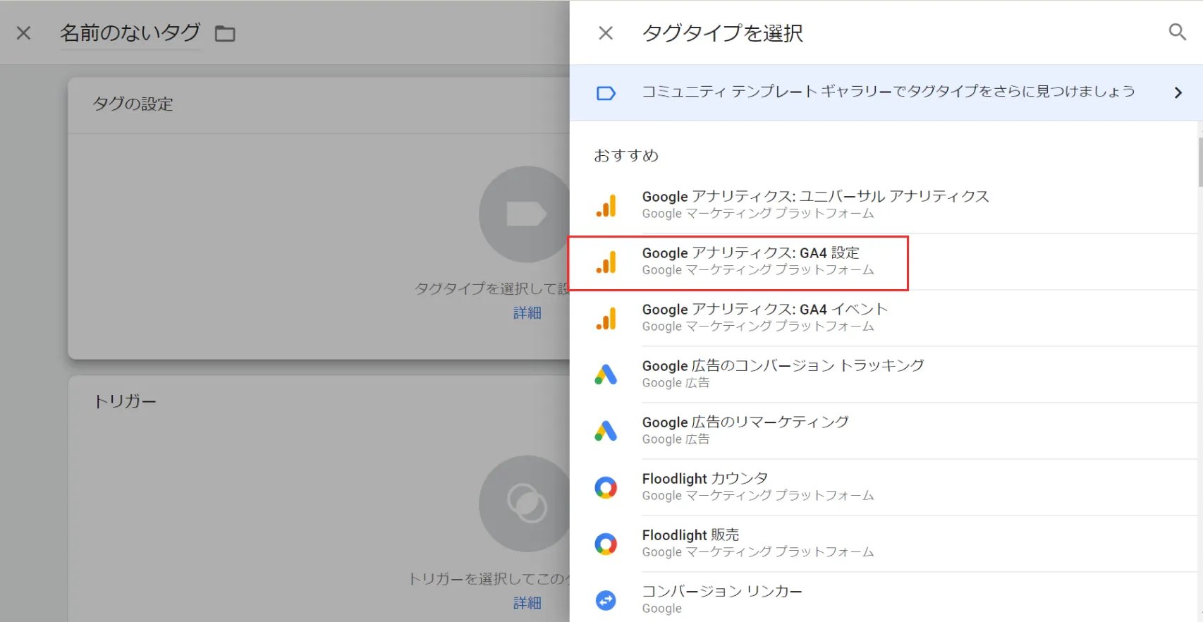 タグの名前を任意で入力し、【タグの設定】をクリックすると、タグタイプが一覧で出てくるので、「Google アナリティクス: GA4 設定」を選択します。
