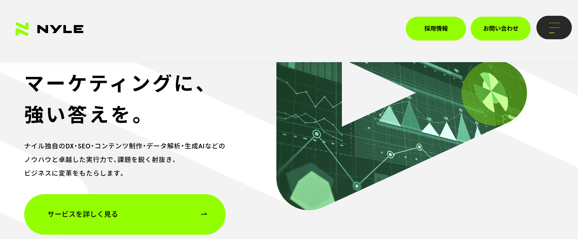 ナイル株式会社は、Webコンサルティング業界、特にSEOの分野で長年にわたりトップクラスの実績を誇る会社です。単なる施策の実行にとどまらず、事業成果に直結するデジタルマーケティング戦略の設計から支援することに強みがあります。LLMO対策においても、その戦略的視点から、AI検索時代に企業がどのように情報を発信し、ユーザーと接点を持つべきかを設計します。難易度の高いキーワードでの対策や、業界全体の動向を見据えた中長期的な戦略を求める企業に適しています。