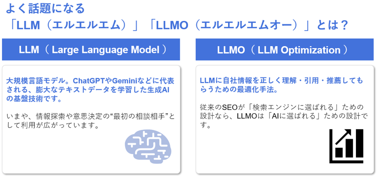 この新しい検索の形に対応するのが「LLMO(大規模言語モデル最適化)」です。これは、AIに自社の情報を正しく理解させ、引用・推薦してもらうための最適化手法です。