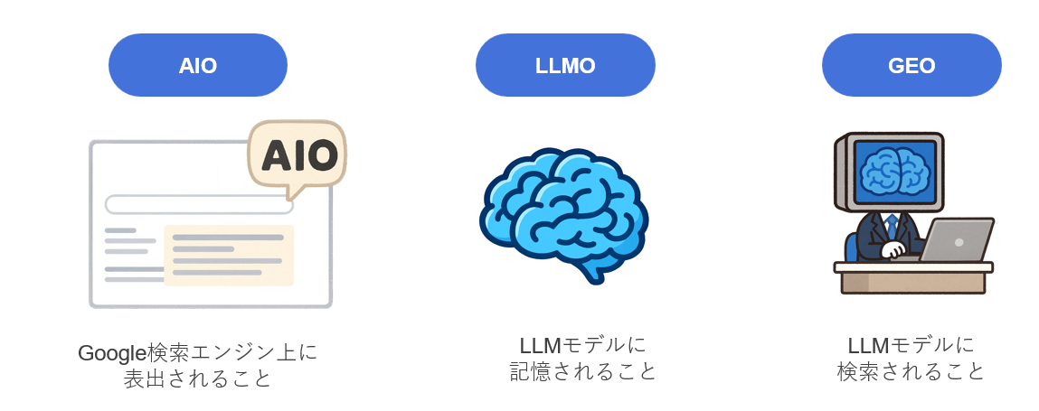 LLMOと同時に「AIO」や「GEO」といった新しい用語も登場しており、混乱する方も多いでしょう。これらは目的や対象範囲が異なります。結論から言うと、LLMO(AI最適化)という大きな枠組みの中に、AIOやGEOが含まれるイメージでSEデザインは定義しています。