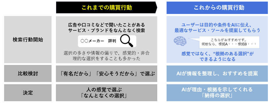 従来のSEO(検索エンジン最適化)は、「検索結果のランキングで1位を目指す」ことが目的でした。しかし、AIが検索結果の上部で直接回答を示すようになると 、ユーザーは1位のサイトをクリックせず、AIの回答だけで満足してしまう可能性があります。今やAIは、情報探索や意思決定における“最初の相談相手”となりつつあるのです。