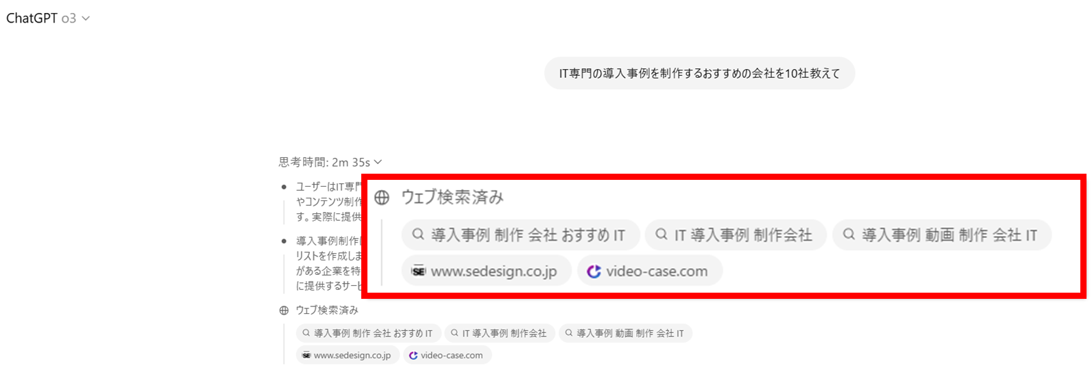 AIが能動的にウェブ検索を行い、情報を解釈してユーザーに最適な回答を生成するプロセスに対する最適化。 | Web検索を実行し、最新情報を取得して推奨を行うWeb検索連動型AI(例: ChatGPTのWeb検索、Bing検索)。 |