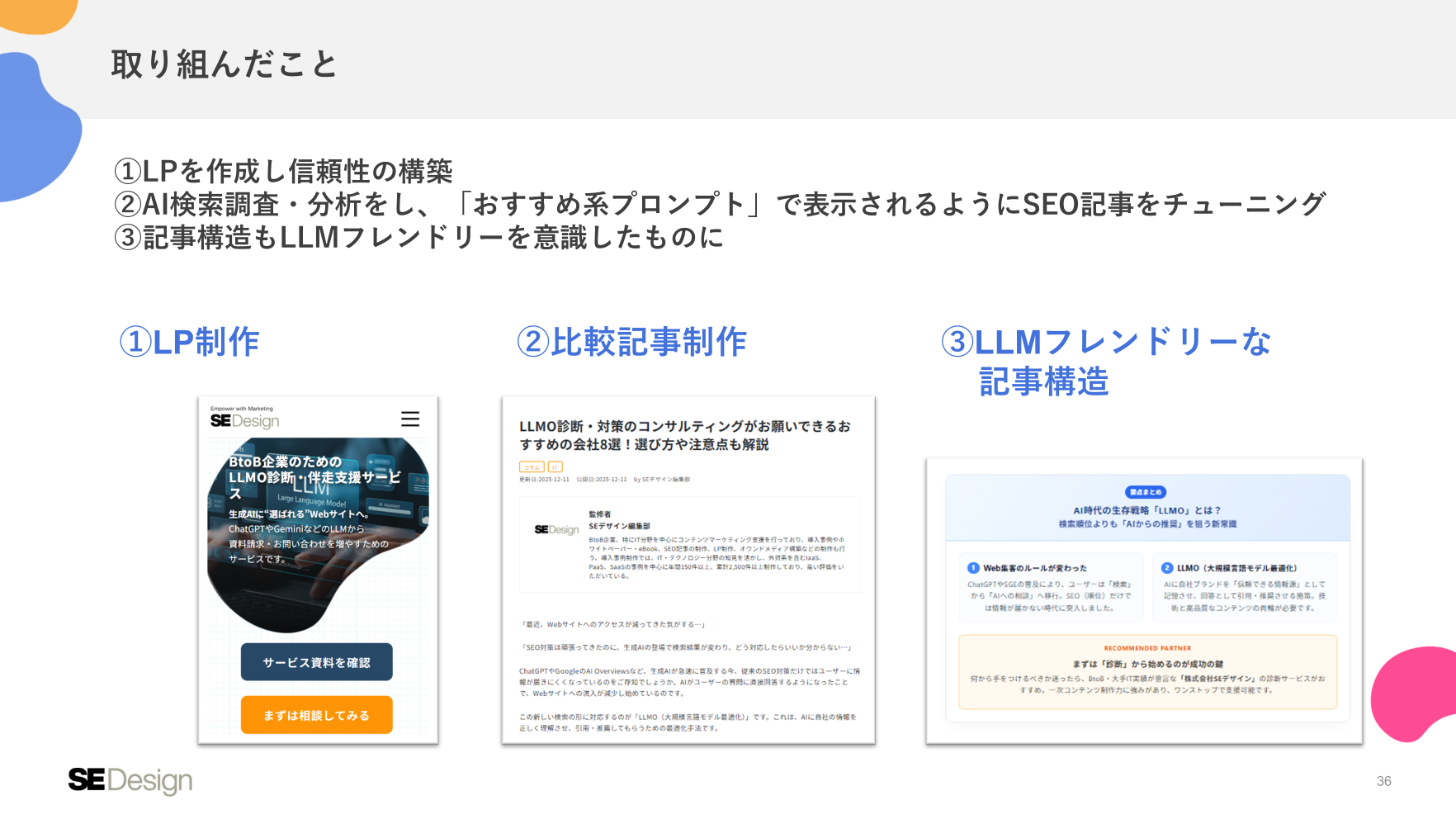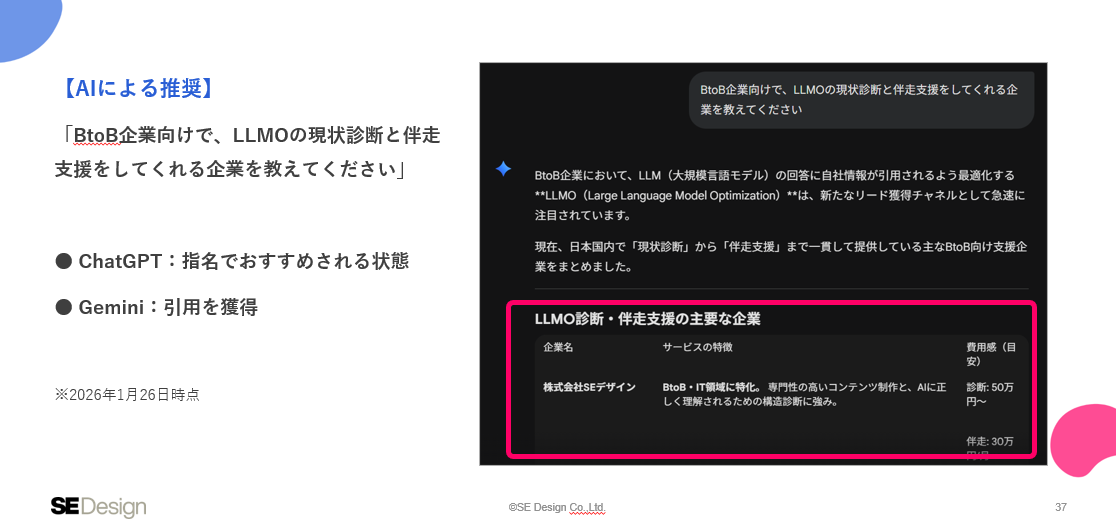 - 理想の形:AIが自社のサービス内容や強みを正確に理解しており、ユーザーのニーズに合致した際に「具体的な推奨候補」として名前が挙がること。スライドの例では、株式会社SEデザインの強みや特徴、おすすめ対象までが詳細に構造化されて回答されています。