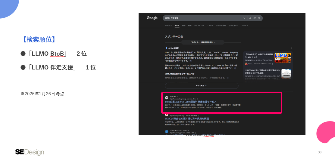 この結果、ChatGPTにおいて「BtoB向けLLMO支援企業」として指名で推奨され、Geminiでも正確な引用を獲得することに成功しています。特筆すべきは、LLMO施策が従来のSEO順位にも強力に相関している点です。AI向けの最適化と並行し、「LLMO 伴走支援」で検索1位、「LLMO BtoB」で2位を獲得するなど、検索エンジンとAI双方から高い評価を得る結果となりました。