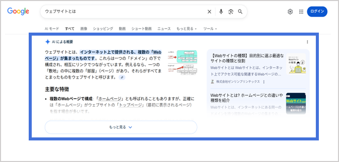 AI Overviewsとは、ユーザーが検索した際、従来の検索結果(青いリンク)の上部に、AIが生成した「回答の要約」を表示する機能です。