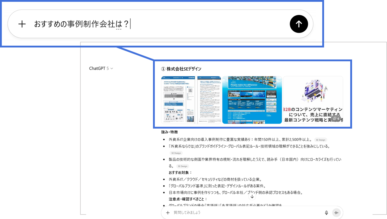 以下は、ChatGPTなどの対話型AIにおける回答画面です。ここでは、ユーザーのより具体的な悩み(例:「おすすめの事例制作会社は?」)に対し、AIが特定の企業をピックアップして紹介しています。