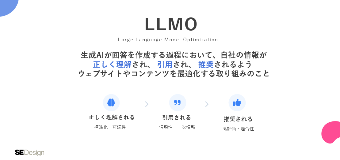 自社サイトがLLMOにどの程度最適化されているか確認したい、または専門家に相談したいとお考えの方に向けて、SEデザインのLLMOサービスをご用意しています。以下より無料でサービス資料をご覧いただけます。